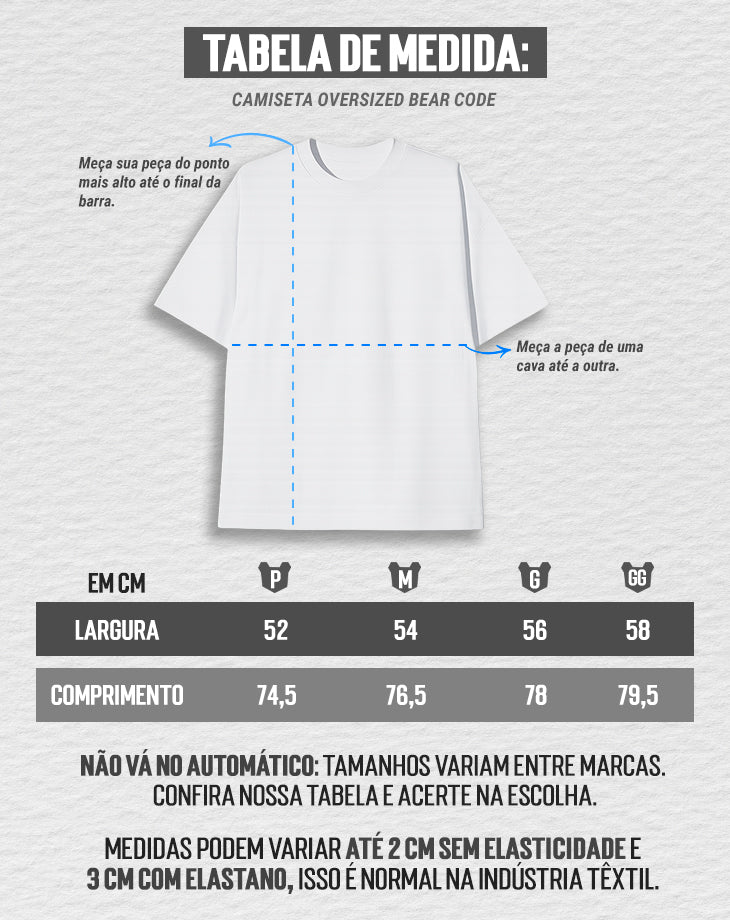 A Camiseta BEAR CODE une conforto, durabilidade e estilo streetwear. Feita em malha 50% algodão e 50% poliéster, possui gramatura média, toque macio e caimento estruturado.