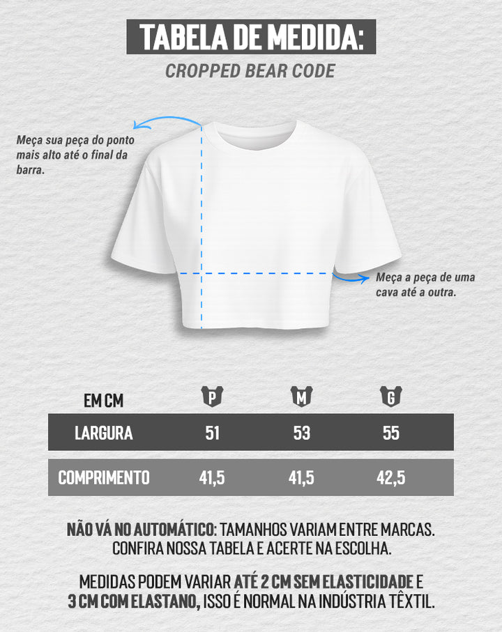 O Cropped BEAR CODE combina estilo esportivo e conforto em um visual moderno. Feito em malha 50% algodão e 50% poliéster, tem gramatura média, toque macio e caimento estruturado.